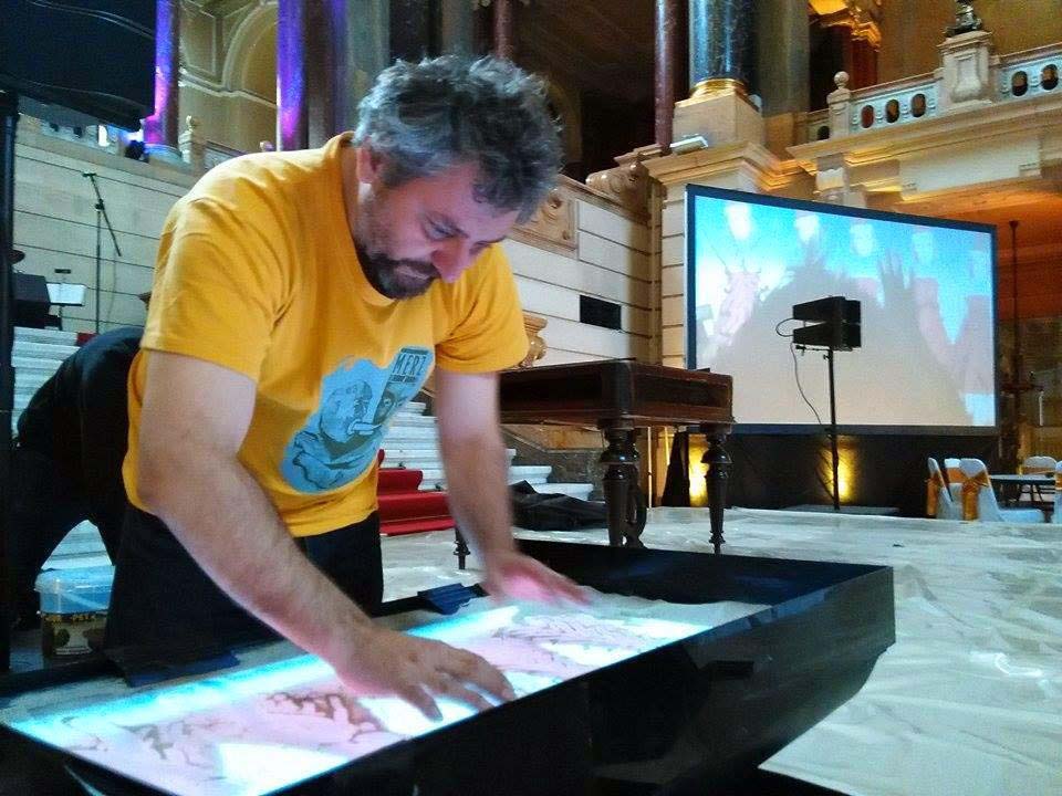 Szilveszter napján a budapesti Néprajzi Múzeumban az Uniworld szilveszteri partiján léptünk fel. Az előadásra nyitóképnek logóval ellátott homokrajz készült, amit a képen is láthattok. Az aznapi próbán és beszerelésen is készült pár fénykép. Estére ilyen hangulatos helyszínt varázsoltak, a hétköznapokban is lenyűgöző múzeumi aulába.
