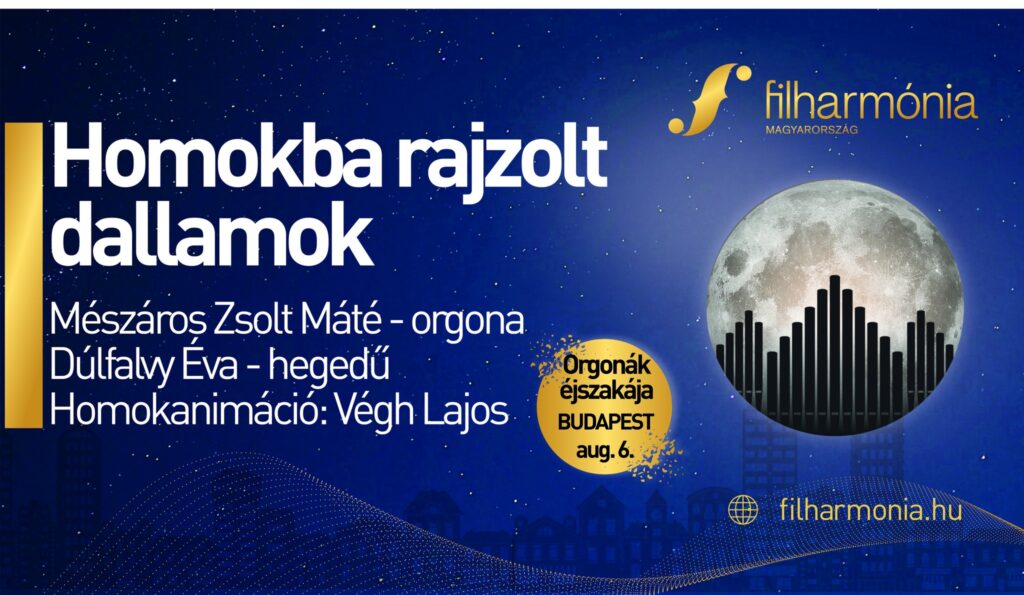 Egy exkluzív este varázslattal és zenével. Végh Lajos Digitális Homokanimációja különleges vizuális élményt nyújt Mészáros Zsolt Máté Junior Prima-díjas magyar orgonaművész, Liszt-kutató, a Budapest-Belvárosi Nagyboldogasszony Főplébánia-templom zeneigazgatója és Dúlfalvy Éva hegedűművész műsorához. Izgatottan várjuk a közös műsort, amelyet az Orgonák éjszakája budapesti koncertje ígér augusztus 6-án a Mátyás-templomban.