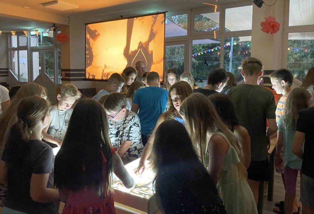 A győrújbaráti gyermektábor 10 homokanimációs interaktív programot tartott júniustól augusztus végéig. Végh Lajos digitális homokanimációs művész gyermekek számára komponált 15 perces produkcióját követően a sok kis világító homokdoboz köré gyűlt aprósággal közösen alkot kifáradásig. A programról a tanárnénik készítettek fotókat és videókat a szülőknek.